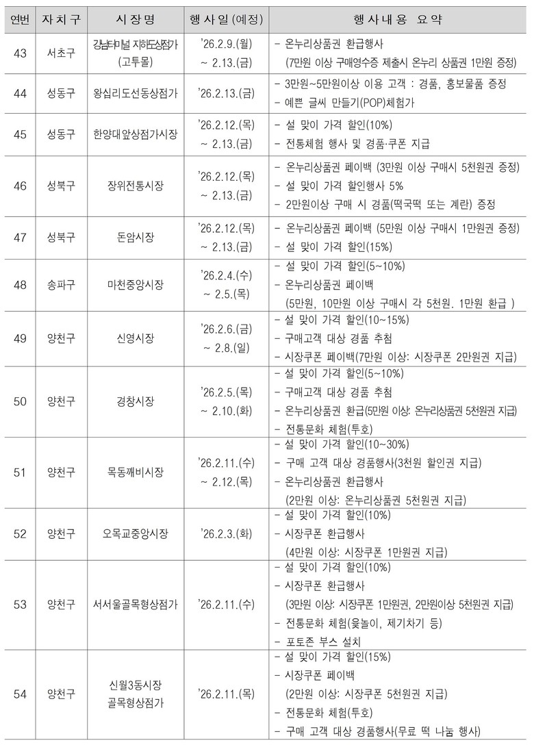 가격 할인과 함께 명절 분위기를 살리는 전통문화 공연과 체험 행사(떡메치기, 제기차기 등)도 마련된다. 이 밖에도 시장별 온누리상품권·사은품 증정 등도 함께 진행해 시민들의 설 장바구니 부담을 낮추고 전통시장 소비를 촉진할 계획이다.