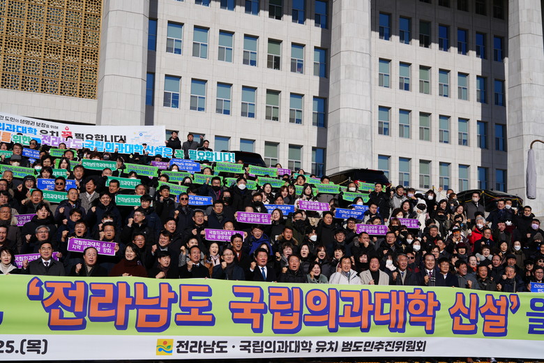 [세계타임즈 = 백진욱 기자] 1월 25일 전라남도 국립의과대학 유치 범도민추진위원회(이하 범추위)가 국회의사당 앞에서 ‘전라남도 국립의과대학 유치 범도민 결의 행사’를 개최하고, 국립의과대학 유치에 대한 의지를 굳건히 다졌다.
