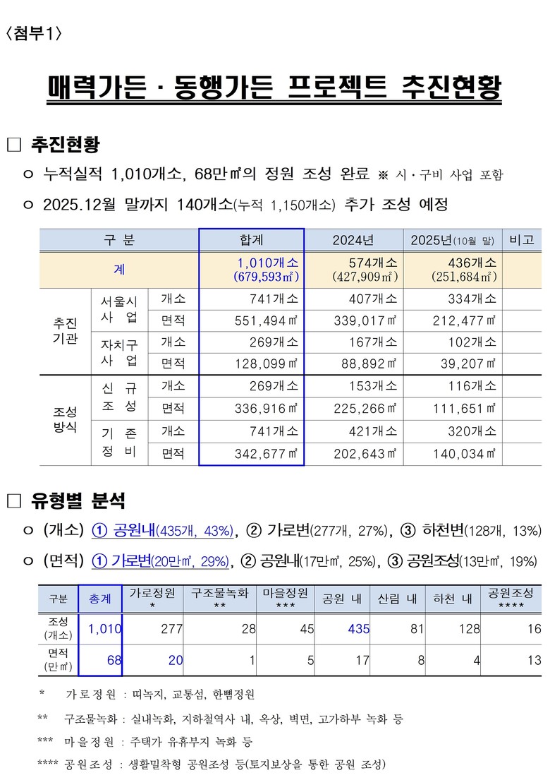 이번 프로젝트 조기 달성은 서울시와 자치구의 협력이 큰 역할을 했다. 당초 서울시가 단독으로 사업을 추진했으나 25개 전체 자치구가 동참 의사를 보이면서 조성 속도가 크게 앞당겨진 것이다. 1,010곳 중 서울시 추진이 741곳(73%), 자치구 추진이 269곳(27%)이다.