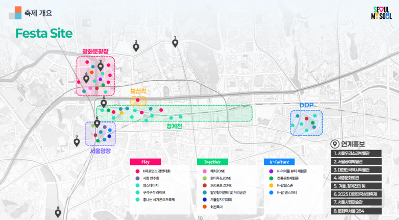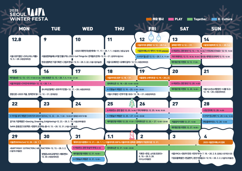 <2025 서울윈터페스타>는 서울 주요 도심 광화문광장~청계천~서울광장~DDP~보신각~우이천 6곳을 하나로 잇는 초대형 겨울축제로, 올해는 공연(Play), 체험(Together), K-컬처가 어우러진 이색프로그램을 대거 운영해 전 세계인이 공감하고 참여할 수 있는 글로벌 축제로 거듭난다.