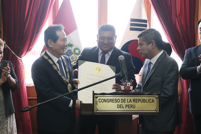 이후 정 의장은 갈라레따 국회의장으로부터 양국 우호관계에 기여한 공로로 페루 국회의 ‘대십자 훈장(La Medalla de Honor del Congreso de la República del Perú)'을 수여받았다.