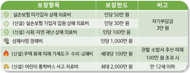또한 ‘아동 안전을 위한 보장’ 항목도 놓치지 않았다. 만 12세 이하 어린이가 통학버스 사고로 부상을 입은 경우, 부상 등급에 따라 최대 2,000만 원까지 치료비를 보장한다.