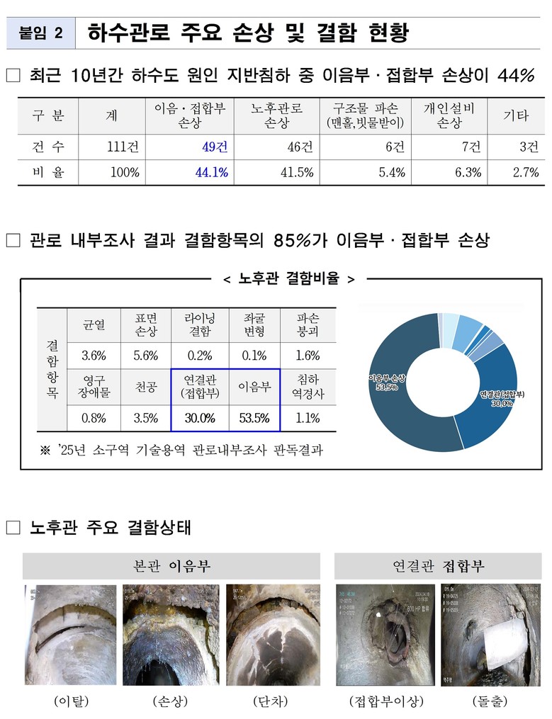 최근 10년간 발생한 하수도 원인 지반침하 111건 가운데 49건(44%)이 이음부·접합부 손상에서 비롯됐으며, 관로 내부 결함의 약 85%도 동일 부위에 집중된 것으로 나타났다.