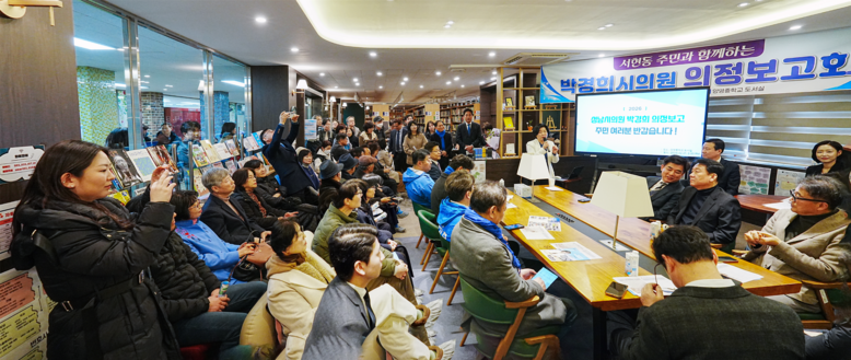 박경희 의원은 그간의 의정활동을 ‘주민 참여’와 ‘현장 중심 실천’이라는 두 가지 키워드로 정리했다. 시민 제보로 시작된 서현역 욱일기 문양 보도블록 교체 사례를 언급하며 현장 중심 의정의 중요성을 강조했고, 7~8년간 이어진 학부모들의 숙원이었던 양영초 체육관 건립 확정 과정을 설명하며 국유지법 통과를 통한 제도적 기반 마련과 향후 복합문화공간 조성 계획을 밝혔다.