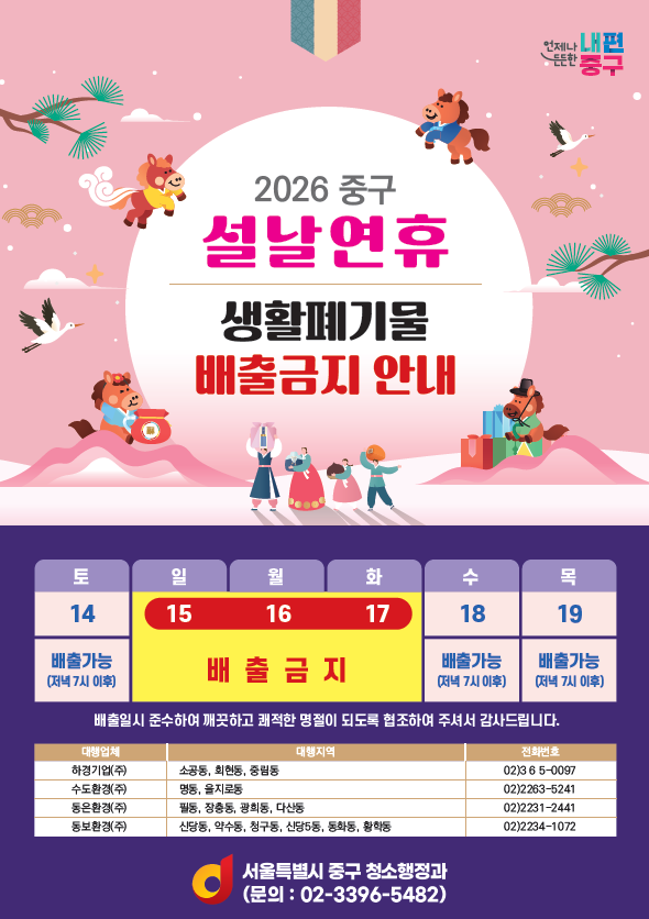 중구는 마포자원회수시설이 설 연휴에 맞춰 휴무에 들어감에 따라 15일부터 사흘간 쓰레기 배출을 금지한다. 쓰레기는 18일 오후 7시 이후부터 정상 배출하면 된다. 구는 주택가와 전통시장, 음식점 밀집지역 등을 중심으로 집중 홍보해 주민과 상인들의 혼선을 줄일 예정이다.