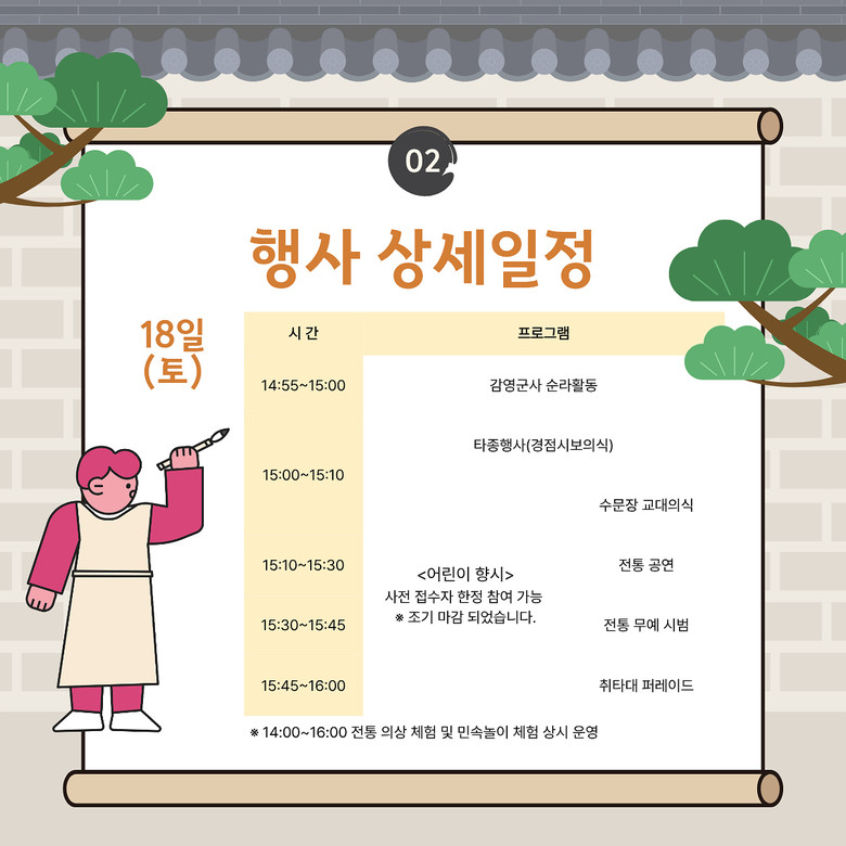 행사 기간 동안 매일 오후 3시부터 4시까지 다양한 전통 의식과 공연, 체험 프로그램이 펼쳐진다. 주요 프로그램은 ▲수문장 교대의식 ▲순라의식 ▲전통무예 시범 ▲취타대 공연 ▲타종 행사(경점시보) ▲어린이 향시 ▲축하공연 등이며, 전통의상 착용 체험과 민속놀이도 상시 운영한다.