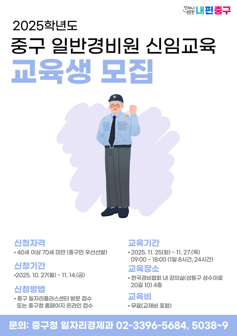 ㅇ 법정의무교육 이수부터 취업연계까지 원스톱으로 지원 [중구 세계타임즈=이장성 기자] 서울 중구가 법정의무교육 이수부터 취업연계까지 원스톱으로 지원하는 실무 중심의 <일반경비원 신임교육 과정>을 무료로 운영한다.