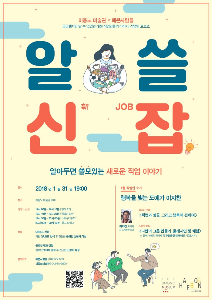 이응노미술관(관장 이지호)은 ‘2018 문화가 있는 날’ (매월 마지막 주 수요일)을 맞아 대전에서 활동하는 다양한 직업인들이 시민들과 함께 본인의 직업 과 삶에 대해 이야기를 나누는 ‘알쓸신잡’(알아두면 쓸모 있는 새로운 직업이야기) 프로그램을 진행한다.