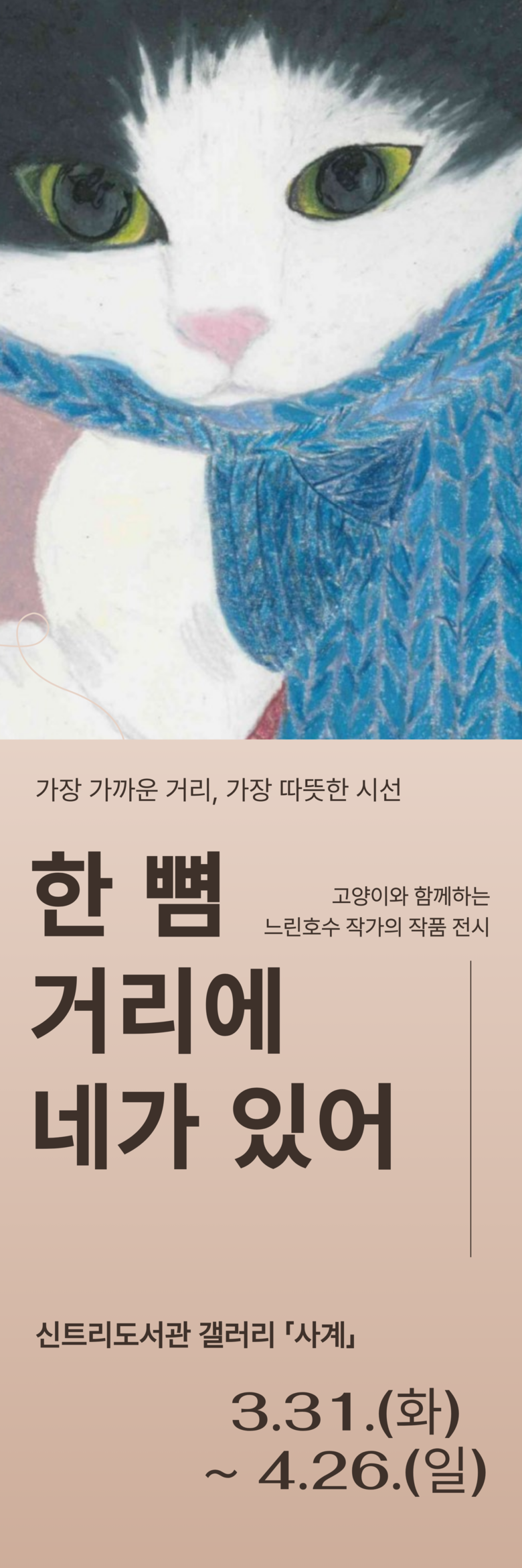 전시에서는 「한 뼘 거리에 네가 있어」를 비롯해 「엄마 손이 좋아」, 「외계고양이와 지구고양이」등 주요 작품을 선보이며, 작가는 일상의 찰나를 포착한 다정하고 포근한 화풍으로 관람객들에게 따뜻한 위로와 공감을 전할 예정이다.