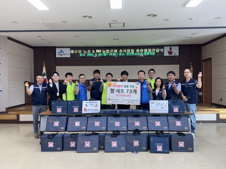 이날 해수부 노조와 농협 정부세종청사금융센터는 저소득 취약계층과 지역아동센터를 위한 250만 원 상당의 햄세트 73개를 기탁했다.
