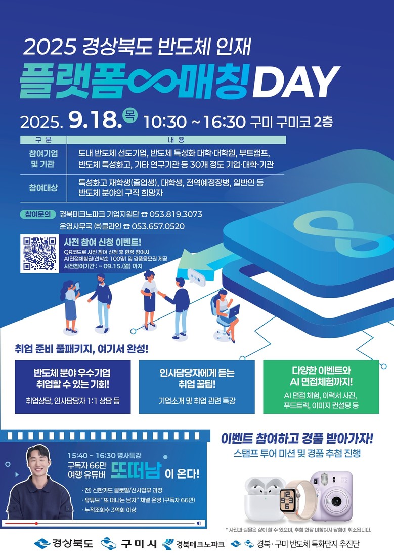 - 미래 산업 변화 대응위한 실무 맞춤형 매칭을 통한 취업 연계 강화 - [세계타임즈=경북 한윤석 기자] 경상북도는 18일 구미컨벤션센터에서 도내 반도체 기업, 반도체 특성화 대학·고등학교, 기타 공공기관 등 400여 명이 참석한 가운데 ‘반도체 인재 플랫폼-매칭 데이’를 개최했다.