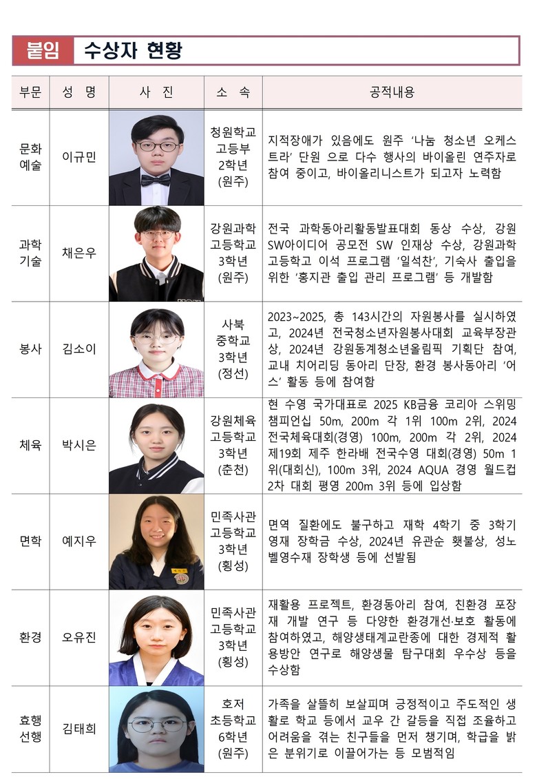 수상자로는 △문화예술 부문 이규민(원주청원학교 고등부 2학년), △과학기술 부문 채은우(강원과학고등학교 3학년), △봉사 부문 김소이(사북중학교 3학년), △체육 부문 박시은(강원체육고등학교 3학년), △면학 부문 예지우(민족사관고등학교 3학년), △환경 부문 오유진(민족사관고등학교 3학년), △효행 및 선행 부문 김태희(호저초등학교 6학년)가 선정되었다.