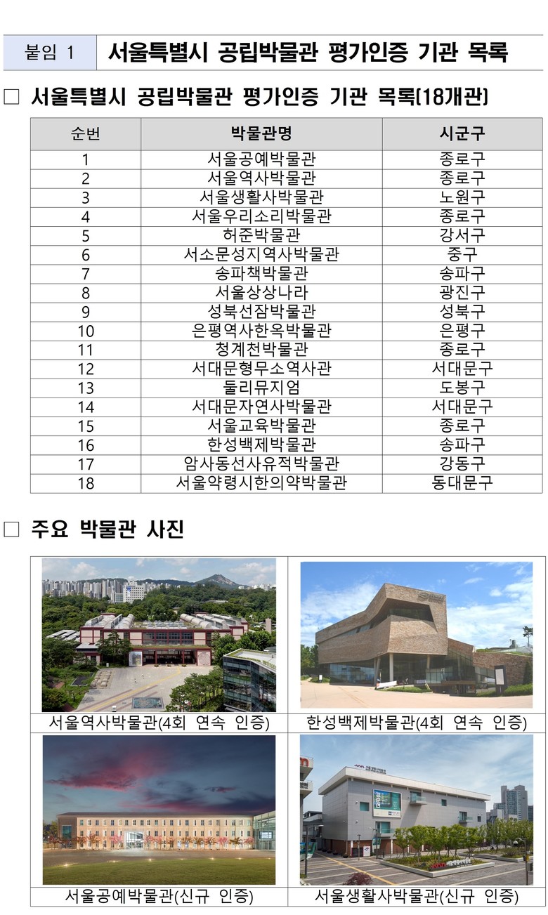 특히 서울역사박물관(종로구), 한성백제박물관(송파구), 서울상상나라(광진구), 서대문자연사박물관(서대문구), 허준박물관(강서구) 등 5개소는 2017년 제도 도입 이후 4회 연속 인증을 달성하며 안정적인 운영 역량과 우수한 공공서비스 품질을 지속적으로 인정받았다.