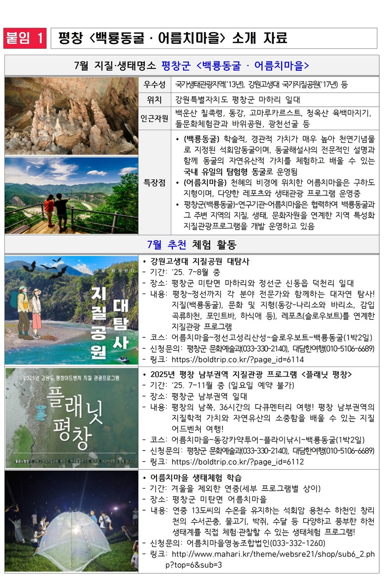 ▶ 플래닛 평창, 지질공원 대탐사 등 지질·생태·문화가 어우러진 프로그램 마련 [강원도 세계타임즈=김민석 기자] 강원특별자치도(도지사 김진태)는 2025년 7월 지질·생태명소로 평창군의 <백룡동굴·어름치마을>을 선정했다고 밝혔다.