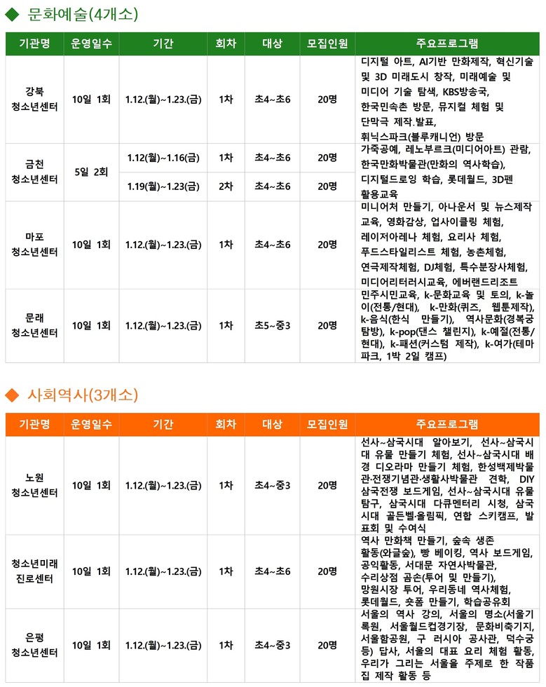- 12.17.(화)부터 ‘청소년몽땅’ 통해 총 420명 선착순 모집…사회적 배려 청소년 우선 모집 [서울 세계타임즈=이장성 기자] 서울시가 다가오는 겨울방학을 맞아 청소년들의 돌봄 공백을 해소하고 진로 탐색의 기회를 제공하는 ‘서울시 청소년 동행캠프’를 추진한다고 밝혔다. 이번 캠프는 2026년 1월 12일(월)부터 23일(금)까지 2주간 서울시립청소년시설 24개소(청소년센터 21개소, 미래진로센터 2개소, 음악센터 1개소)에서 진행된다.