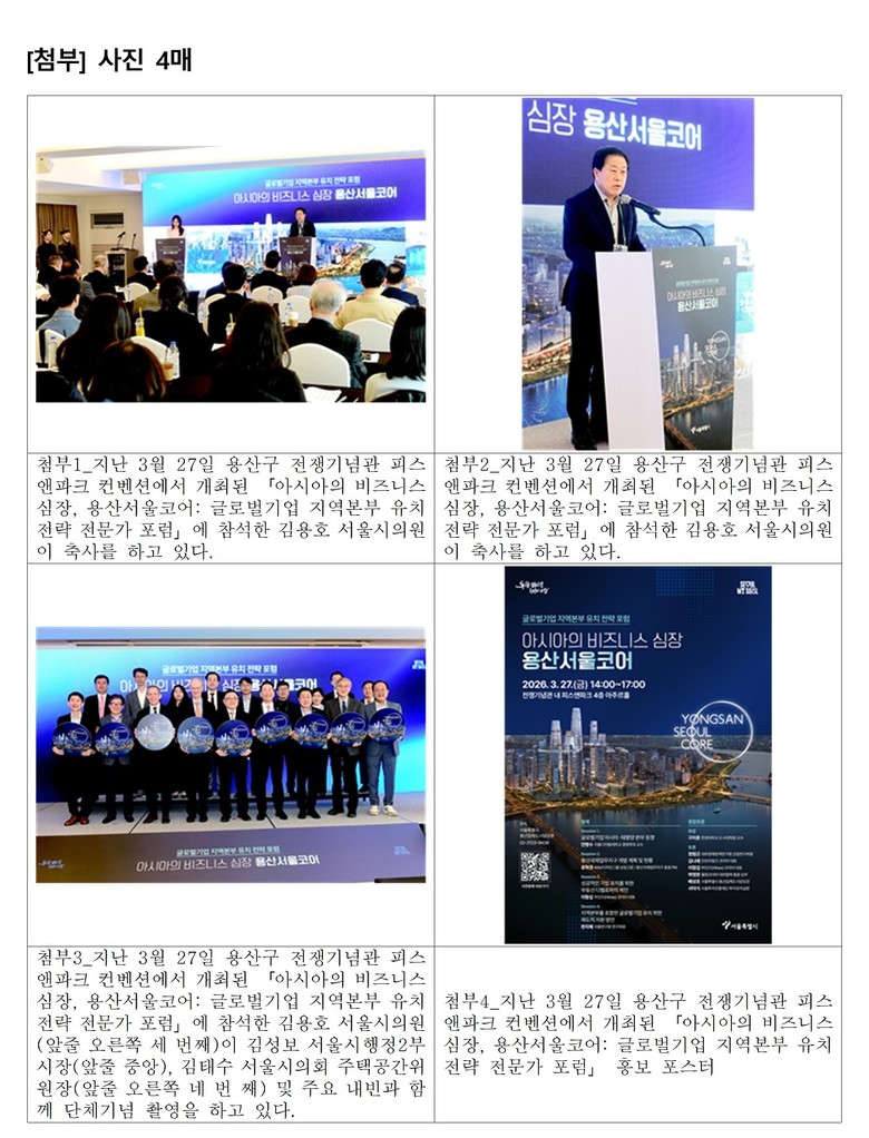 - 김 의원, “용산국제업무지구가 대한민국을 대표하는 글로벌 비즈니스 중심지로 도약시키는 데 서울시의회도 큰 역할 다할 것” 강조 [서울 세계타임즈=이장성 기자] 서울특별시의회 도시안전건설위원회 부위원장으로 활동하고 있는 김용호 시의원(국민의힘, 용산1)은 지난 3월 27일 용산구 전쟁기념관 피스앤파크 컨벤션에서 개최된 「아시아의 비즈니스 심장, 용산서울코어 : 글로벌기업 지역본부 유치 전략 전문가 포럼」에서 용산국제업무지구의 성공적인 조성과 글로벌 기업 유치 전략을 논의하는 뜻깊은 자리를 환영하며 축사를 전했다.