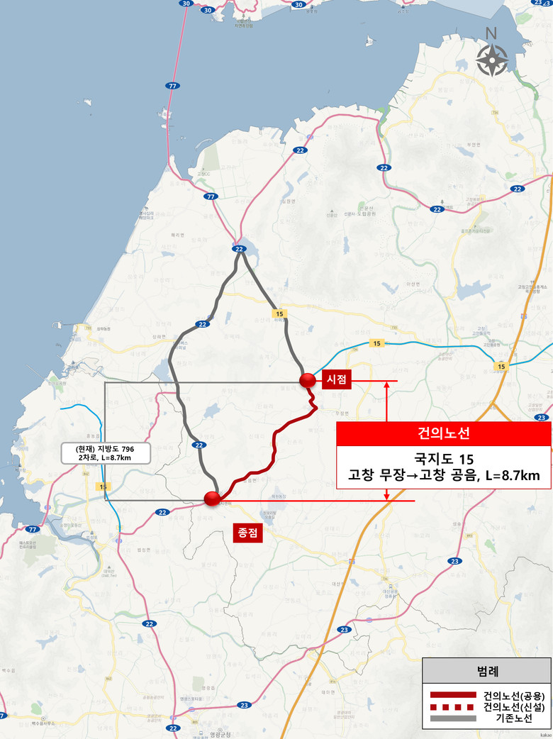 이에 고창군은 전북특별자치도, 전북연구원등과 협력해 국지도 승격을 위한 건의활동을 해왔고, 윤준병 국회의원도 선거공약으로 선형개량을 약속하며 힘을 실어왔다.