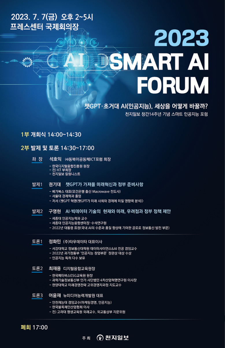 올해로 창간 14주년을 맞은 전국종합일간지 천지일보는 오는 7월 7일 금요일 오후 2시~5시 서울 중구 한국프레스센터 국제회의장에서 ‘챗GPT·초거대 AI(인공지능), 세상을 어떻게 바꿀까’라는 주제로 ‘2023 스마트 AI 포럼’을 개최한다.