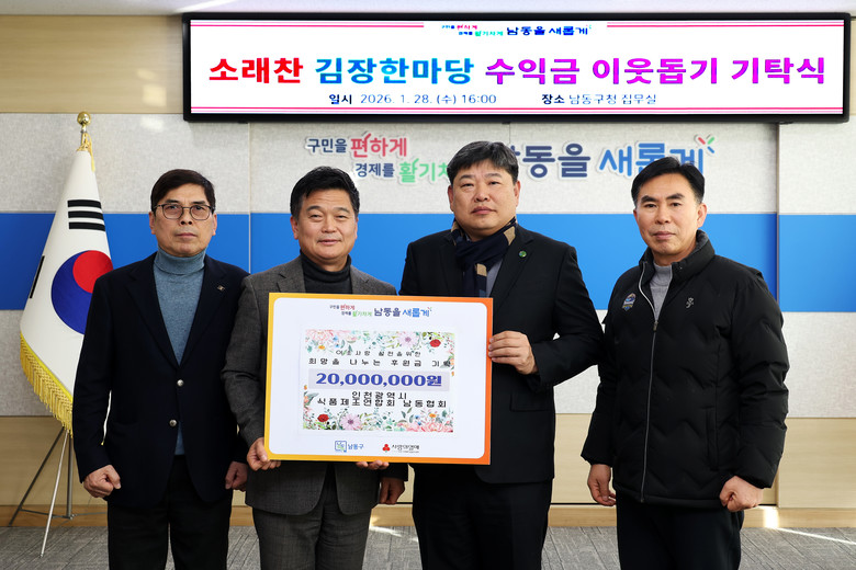 [남동구 세계타임즈=심하린 기자] 인천시 남동구는 최근 (사)인천식품제조연합 남동구협회로부터 ‘2025년 남동구 소래찬 김장한마당’ 판매 수익금 총 2천만 원을 기탁받았다고 30일 밝혔다.