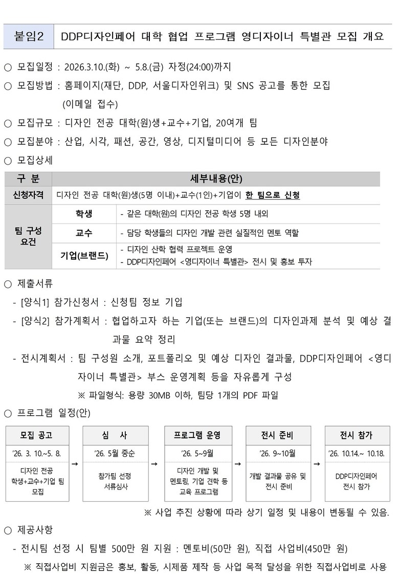 아울러 5.8.(금)까지는 오는 10.14.(수)~10.18.(일) 서울디자인위크 기간 중 열릴 ‘2026 DDP디자인페어’와 연계, 대학생과 기업이 협업 디자인 결과물을 제작해 산업적 확장 가능성을 검증하는 실전형 산학협력 프로그램 ‘영디자이너 특별관’ 참가팀도 모집한다.
