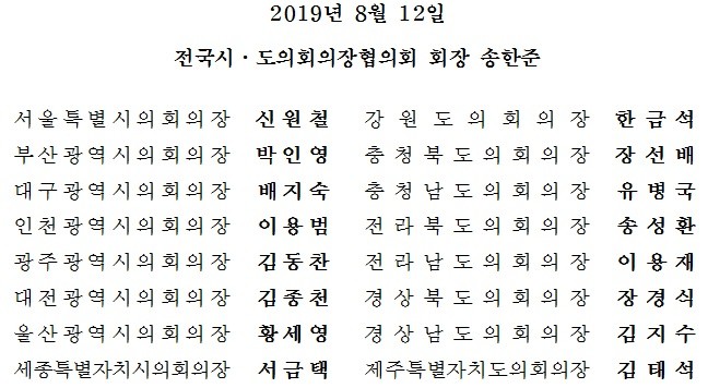 이에 전국 17개 시·도의회 의장들은 국민들이 자발적으로 펼치고 있는 불매운동 등의 각종 활동을 지지하며 국민들과 함께 승리를 쟁취할 것임을 분명히 밝힌다. 또한 피해를 입은 기업들에 대한 지원과 함께 이번 경제침략에 대한 승리만이 아닌 동북아 지역의 평화와 공존을 위한 초석을 만들어 나아갈 것이다.