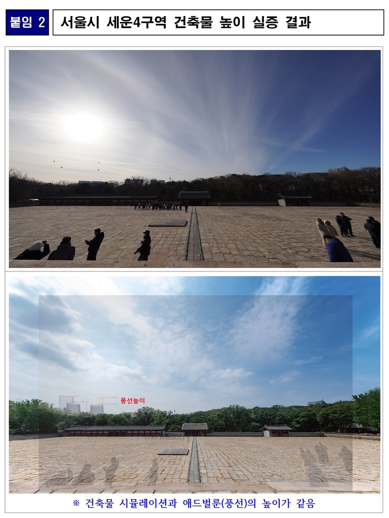 서울시가 현장에 설치한 애드벌룬은 해당 건축물의 실제 높이를 객관적으로 보여주는 수단입니다. 이 높이가 종묘 정전에 어떠한 영향을 실질적으로 미친다는 것인지, 국가유산청은 구체적이고 객관적인 근거를 제시해야 할 것입니다.