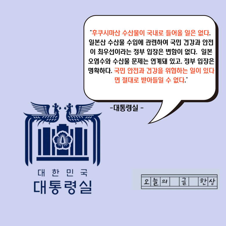 이날 대통령 대변인실은 "국민 건강과 안전이 최우선인 정부 입장에서 해가 될 수 있는 일본 수산물 수입에 대한 정부 입장은 아직까지 변함이 없다"며 못을 박았다.