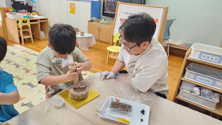 이번 학부모 참여수업에서는‘흙이랑 놀아요’를 주제로 한 놀이 테마로 이뤄져 모든 활동에 학부모와 자녀가 함께 참여하였다. ▲텃밭 케이크 만들기 ▲색점토 접시 만들기 ▲쥐라기 월드 등 유아의 흥미를 자아내는 다양한 놀이를 통해 몰입력을 증가시켰다.