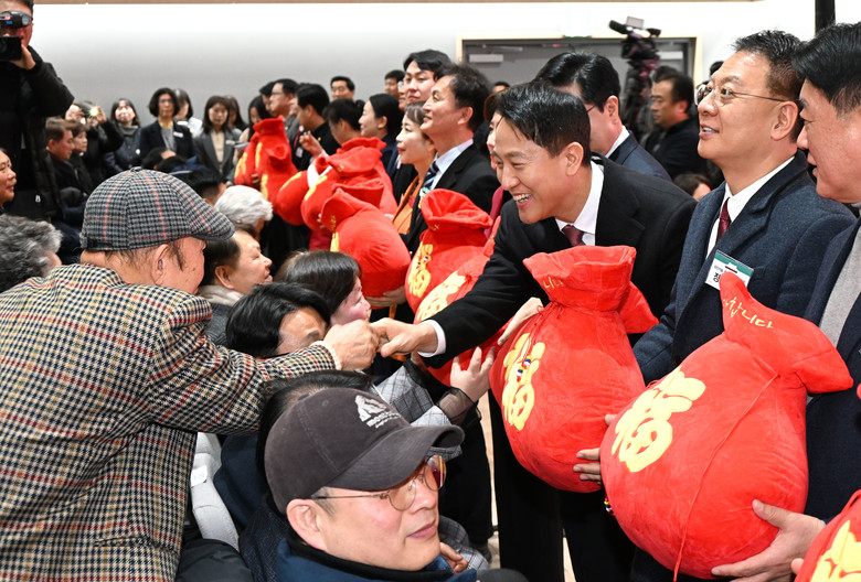 | ▲ 오세훈 서울시장이 6일(화) 열린 '2026년 동작구 신년인사회'에서 복주머니 전달 퍼포먼스를 하며 구민에게 인사하고 있다. |