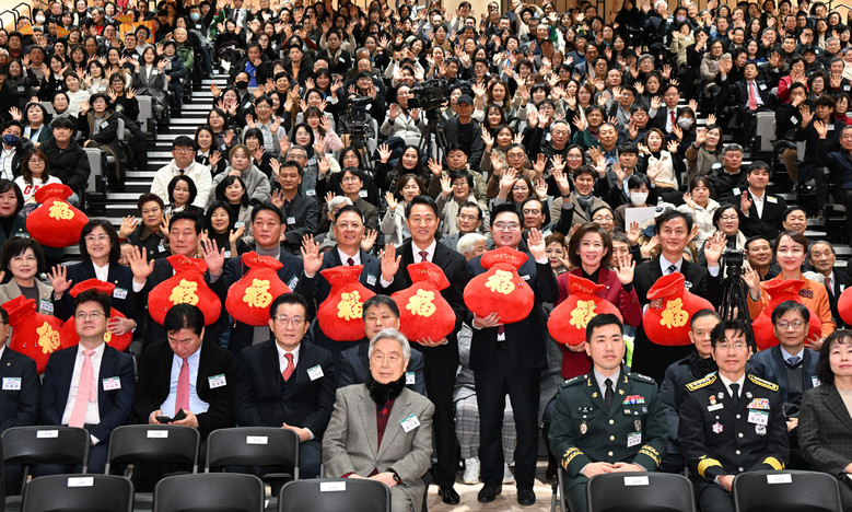 | ▲ 오세훈 서울시장이 6일(화) 열린 '2026년 동작구 신년인사회'에서 복주머니를 들고 기념촬영 하고 있다. |