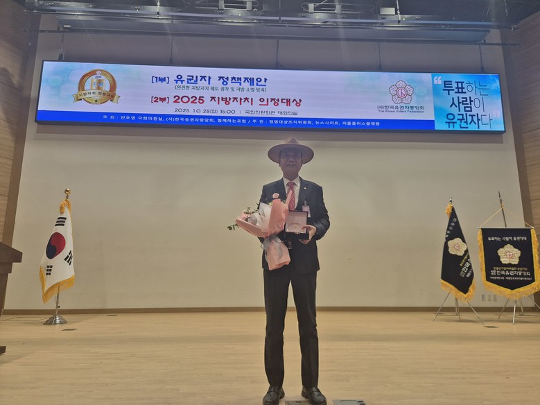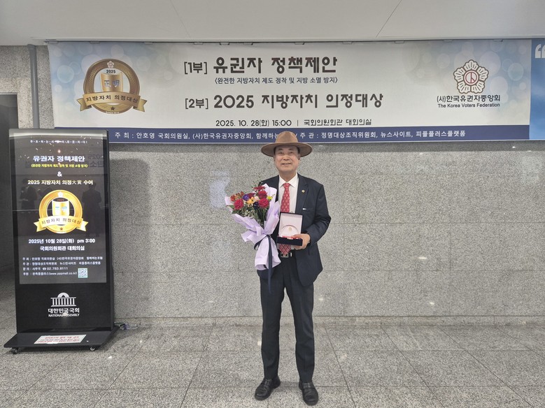 [충남 세계타임즈=이현진 기자] 충청남도의회 방한일 의원(예산1·국민의힘)이 ‘2025 지방자치 의정대상’을 수상했다. 이번 시상식은 10월 28일(화) 오후 3시, 여의도 국회의원회관 대회의실에서 (사)한국유권자중앙회와 함께하는 포럼이 공동 주최하고, 정명대상조직위원회와 뉴스인사이트, 피플플러스플랫폼이 공동 주관해 개최됐다.