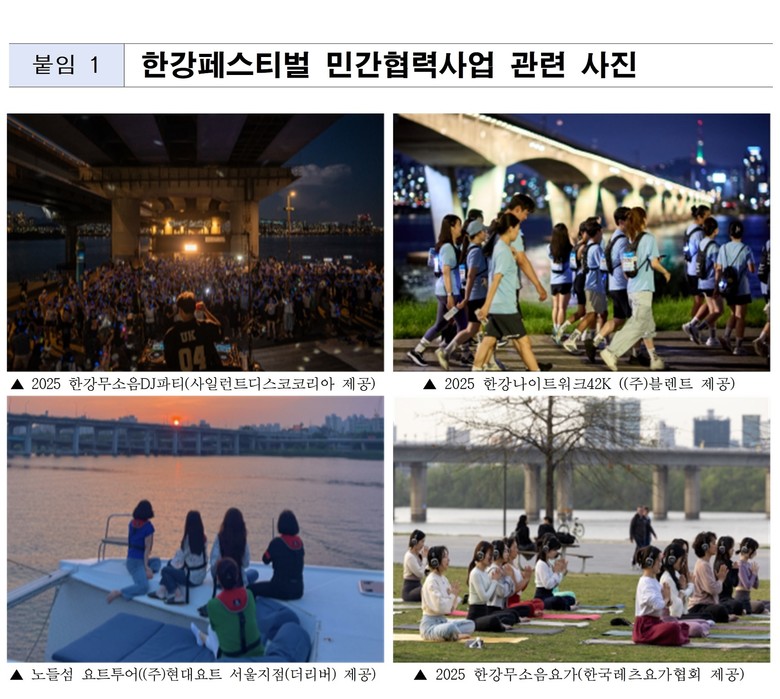 올해 민간협력사업 공모는 ▴민간기업·단체가 독자적인 프로그램으로 축제에 참여하는 ‘단독사업’과 ▴한강공원 내 민간사업자가 기존의 상품을 이용하여 축제와 연계한 특별 프로모션을 기획/진행하는 형식의 ‘프로모션 협력사업’ 두 가지 방식으로 진행된다.