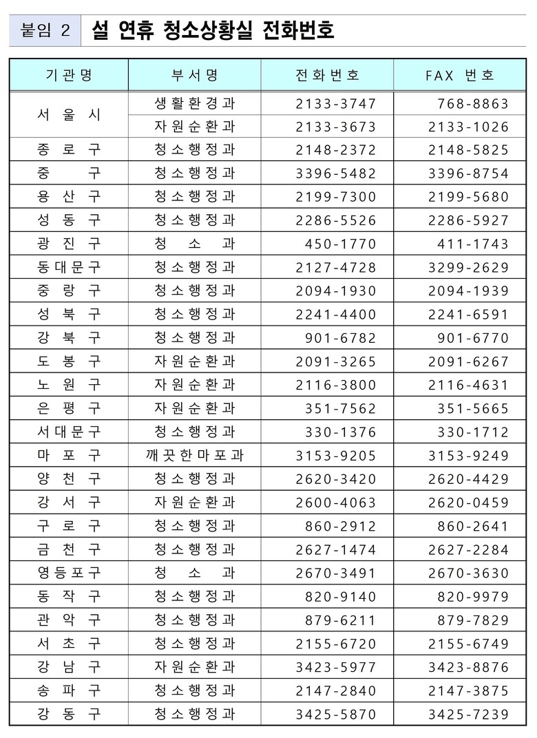 연휴 기간 청소 관련 민원은 120(다산콜센터)나 해당 자치구 청소상황실로 문의하면 된다.