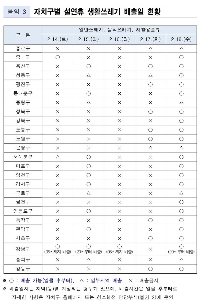 - 연휴 기간 내 자치구·동별 배출일과 품목 달라 자치구·동별 배출일 사전 확인해야