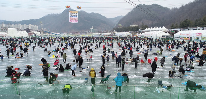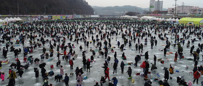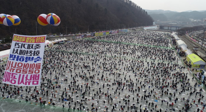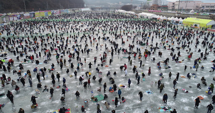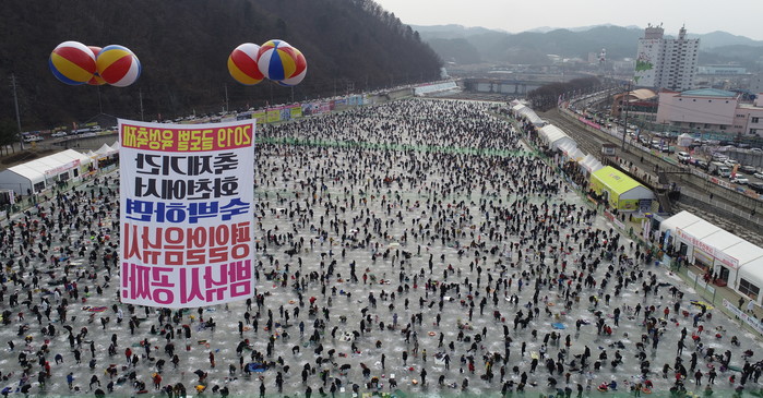[화천군=세계타임즈 김민석 기자] 2019 화천산천어축제장이 12일 주말을 맞아 발디딜틈없이 관광객들로 성황을 이루고 있다.