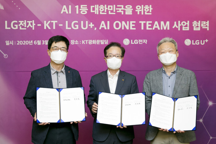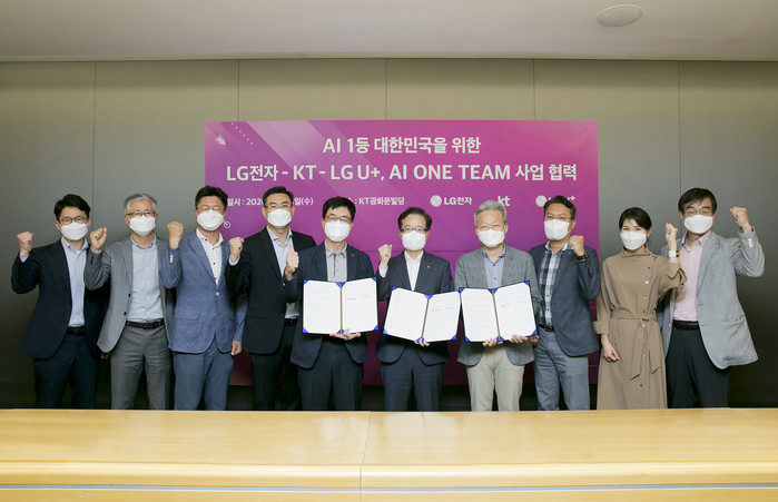 KT(대표이사 구현모, www.kt.com)가 3일 서울 종로구 KT 광화문빌딩 East에서 LG전자, LG유플러스와 ‘대한민국 인공지능(AI) 1등 국가를 위한 업무협약(MOU)을 체결했다고 밝혔다. 이번 협약식에는 AI 원팀을 대표해 KT AI/DX융합사업부문장 전홍범 부사장, LG전자 최고기술책임자(CTO) 박일평 사장, LG유플러스 FC부문장 이상민 부사장 등 주요 관계자들이 참석했다.