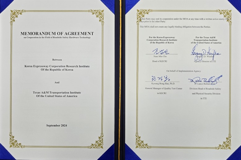[세계타임즈 = 이영진 기자] 한국도로공사(사장 함진규)는 지난 9월 27일 도로교통연구원이 아시아 최초로 실물충돌시험에 대한 미국 인증을 취득하고, 텍사스교통연구원(TTI)*과 관련 업무협약을 체결했다고 밝혔다.
