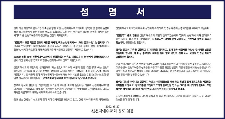 [세계타임즈 백진욱 기자] 신천지예수교 증거장막성전(이하 신천지예수교회, 총회장 이만희)이 28일 국민일보 보도에 대한 성명서를 발표했다.