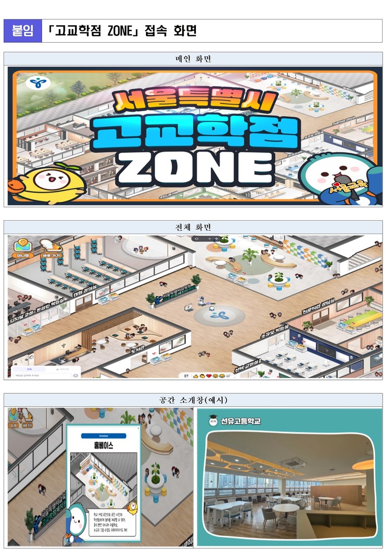 또한 서울 관내 45개 고등학교의 고교학점제 공간 조성 실제 사례도 캐릭터 이동을 통해 확인할 수 있으며, 해당 사례는 서울특별시교육청 고교학점제지원센터 홈페이지를 통해 조회할 수 있다.