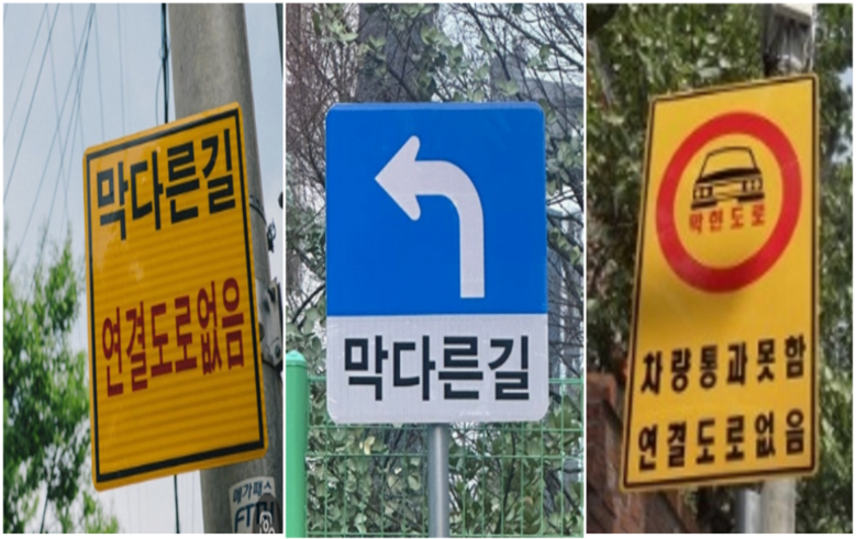 현재 서울 시내 각지에 설치된 ‘막다른 길’ 표지판은 모양과 색, 문구가 제각각이지만, 「도로교통법」과 시행규칙 어디에도 ‘막다른 길’ 표지판의 규격이 명시되어 있지 않다.