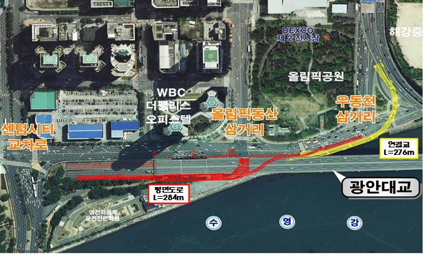 ◈ 준공 시, 해운대구 센텀시티 일원 교통체증 해소 기대 [세계타임즈=부산 이용우 기자] 부산시 건설본부는 '광안대교 접속도로 연결공사'로 인해 광안대교(용호동→센텀시티 방면) 일부(3개 차로 중 1개 차로)가 오는 14일부터 12월 31일까지 통제된다고 밝혔다.