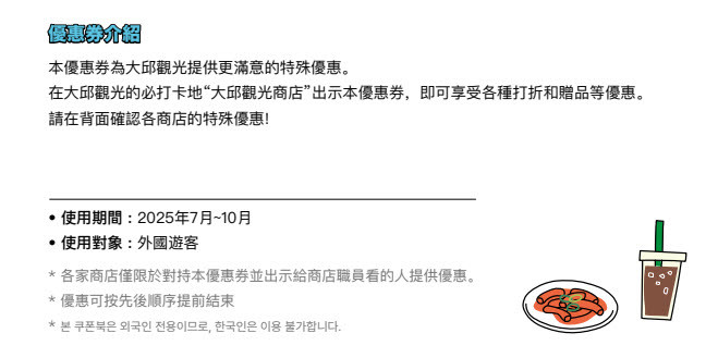 또한, 상점별로 제시되는 전용 쿠폰북을 소지하고 주문 또는 결제 시 매장에서 제시하면 다양한 할인과 부가 혜택도 함께 누릴 수 있다. 쿠폰북은 동성로·동대구역·대구공항 관광안내소 및 참여 상점에서 수령 가능하며, 대구시 공식 여행 정보 앱인 ‘대구트립’에서도 모바일 쿠폰북을 내려받을 수 있다.