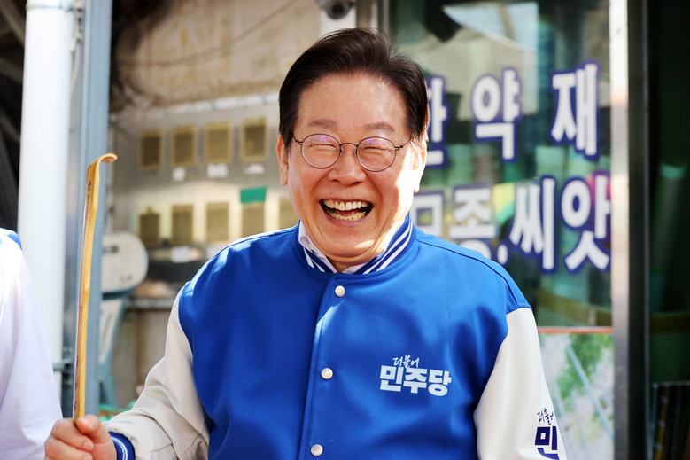 [담양 세계타임즈 = 심귀영 기자] 더불어민주당 이재명 대표가 22일 오전 전남 담양시장에서 이재종 후보 지원 유세를 하는 과정에서 상인이 건넨 효자손을 보며 웃고 있다. 2025.3.22
