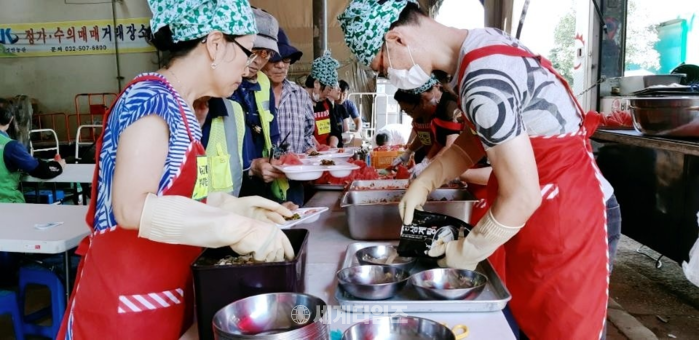 정마리아 부회장은 정성껏 준비한 삼계탕을 드시고 삼산 농수물 도매시장 후원자들이 건강한 여름철 나시길 바랍니다 "면서"경기가 힘든 때일수록 든든한 삼계탕 드시고 올여름을 건강하게 지내시길 빌며 봉사은 언제나 도움을 주기도 하지만 나에게도 보람이란 선물을 얻는 것 같다 말했다