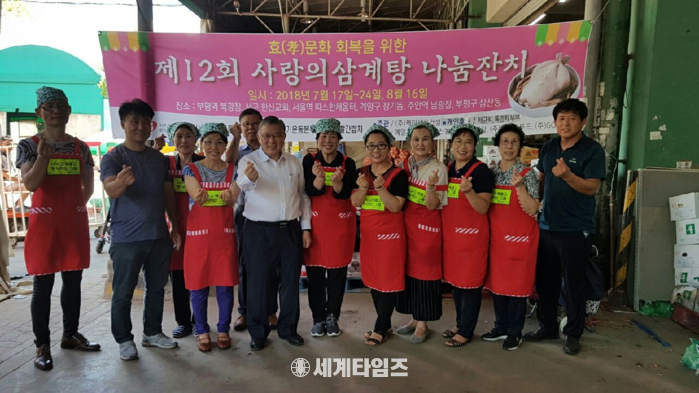 [세계타임즈 심귀영 기자]나누고 베풀고 봉사하는 그룹 소셜 네트워크 서비스 페이스북에 기반을 둔 봉사단체인 나누고 베풀고 봉사하는 행복한 사회를 만들기 위해 나눔 활동을 꾸준히 펼쳐 말복을 맞아 사랑의 빨간밥차 (이선구 이사장)에서 준비한 정성과 사랑이 담긴 삼계탕과 과일 음료수 등을 인천시 부평구 삼산 농수물 도매시장 후원자들에게 삼계탕을 대접해 무더위를 식혔다 .