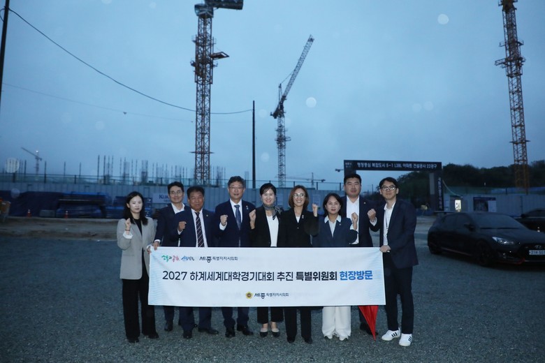 [세종 세계타임즈=이채봉 기자] 세종특별자치시의회(의장 임채성) 2027 하계세계대학경기대회 추진 특별위원회(위원장 김현미, 이하 특별위원회)는 지난 13일 합강동 일원에서 추진 중인 선수촌 건립 현장을 방문하여 공정 진행 상황을 점검하고 향후 활용 방안에 대해 논의했다.