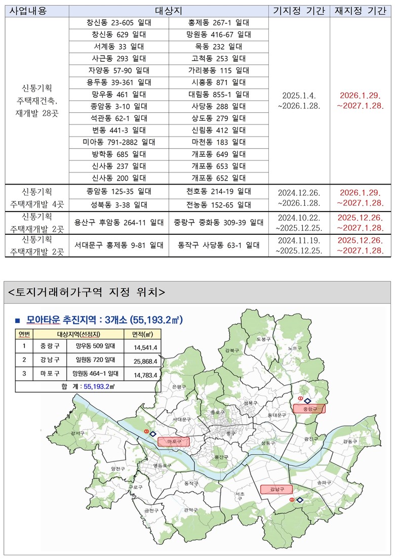 서울시는 12월 10일 제18차 도시계획위원회를 거쳐 모아타운 대상지 3곳은 토지거래허가구역으로 신규 지정하고, 기존 신속통합기획·공공재개발 선정지 63곳은 재지정했다고 밝혔다.