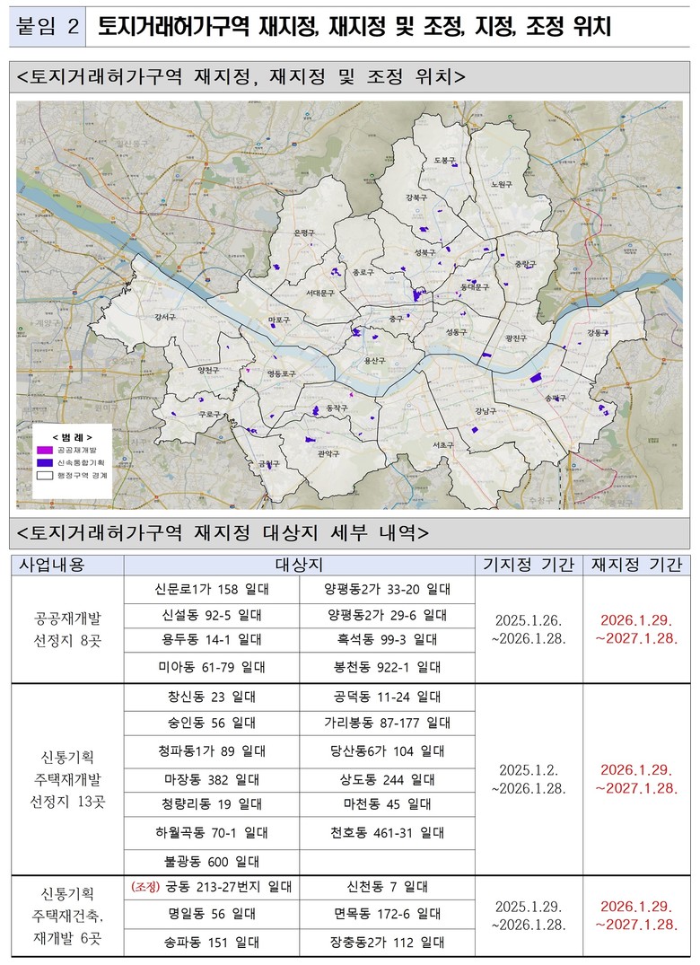 지정기간이 만료될 예정인 기존 공공재개발 8곳, 신속통합기획 재개발·재건축 55곳 등 총 63곳에 대해서는 투기수요 유입 방지를 위해 2027년 1월 28일까지 재지정했다.
