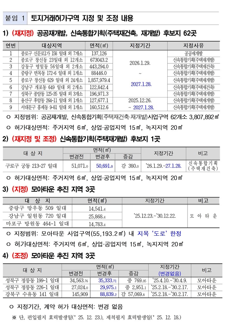 - 모아타운 3곳 도로 대상으로 ‘신규 지정’, 투기 방지… 12월 23일부터 5년간 발효