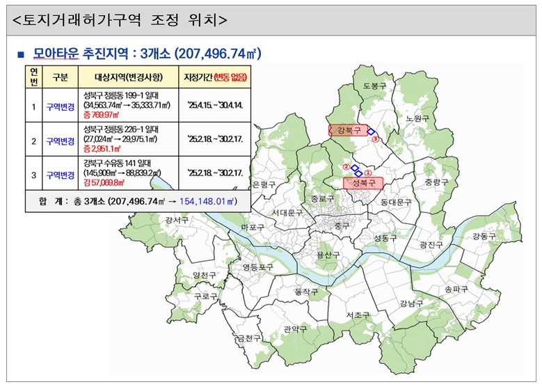 기존 지정됐던 모아타운 대상지 3곳도 진입도로 확보, 구역계 정형화 등의 사유로 구역계가 변경돼, 변경 경계에 맞춰 토지거래허가구역이 조정됐다. 지정기간은 기존과 동일하게 유지된다.